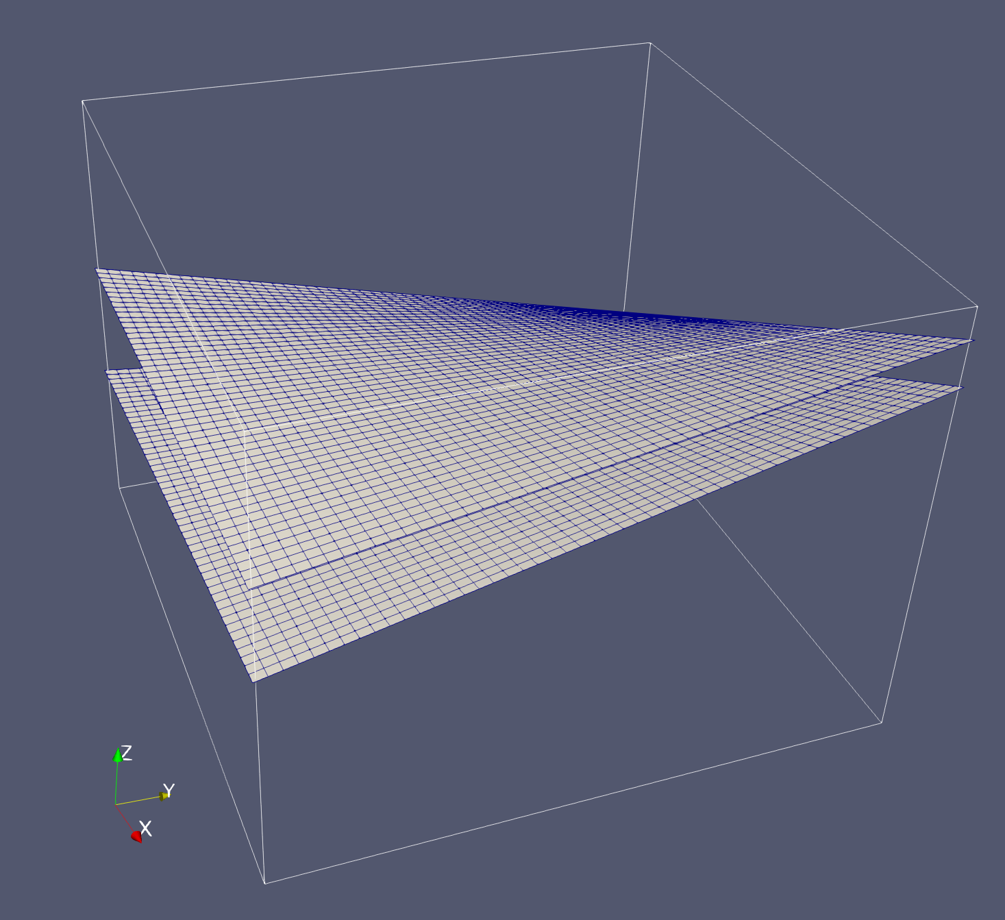 Note that the X and Y domains of the quad mesh exceed that of the hex mesh. This serves two purposes. First, it serves as a helpful visualization aid, allowing one to easily see how the surfaces cut the hex mesh without adjusting opacity. Second, and more importantly, it ensures that all elements cut by the surfaces will be properly recognized as such. Rounding errors may affect elements at the perimeter of the cutting planes from being properly labeled.