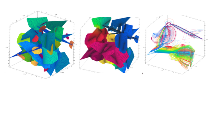 This test case consists of four user defined elliptical fractures within a a cubic domain with sides of length one meter. In this case the ellipses are approximated using 8 vertices. We have set the meshing resolution to be uniform by including the argument slope=0 into the mesh_networks function in run_explicit.py.